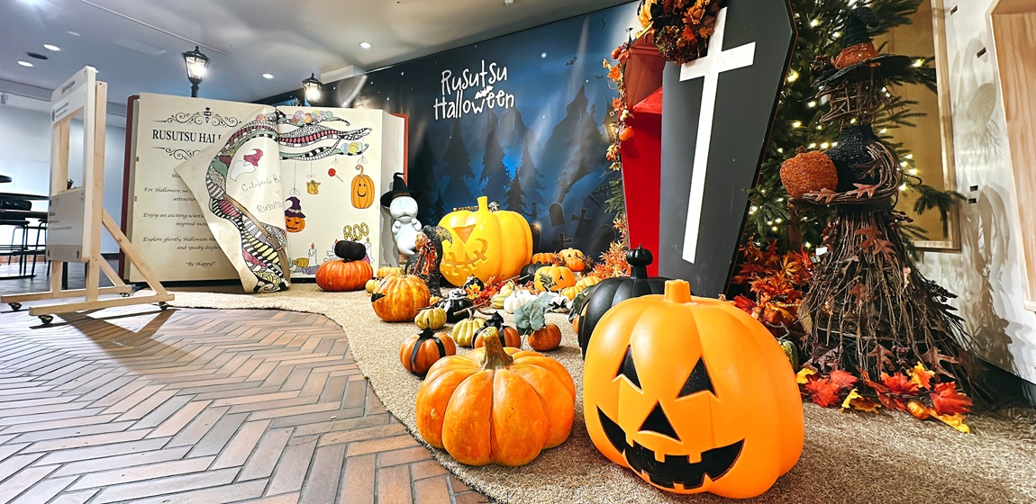 館内のあちこちもハロウィンのデコレーションでいっぱい。「パブ クリケット」前には、かぼちゃやおばけ姿のダニエル、さらに「RUSUTSU Halloween」と書かれた大きな本のオブジェが登場。かぼちゃを手に記念撮影するのもおすすめです。
