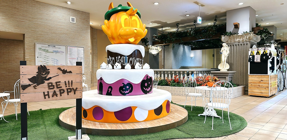 ショップ「プルミエネージュ」前には、高さのある巨大なハロウィンケーキ。オレンジ・紫・黒で彩られたケーキに白いクリームが映え、クリームには表情豊かなかわいい顔が描かれています。お気に入りの表情を探してみてください。ご一緒に「Be Happy!」