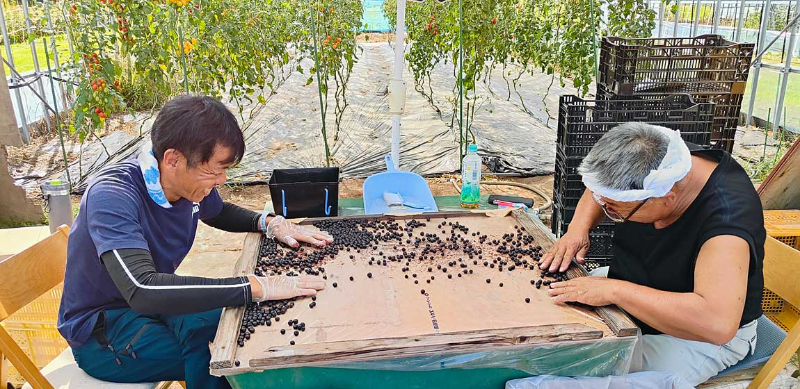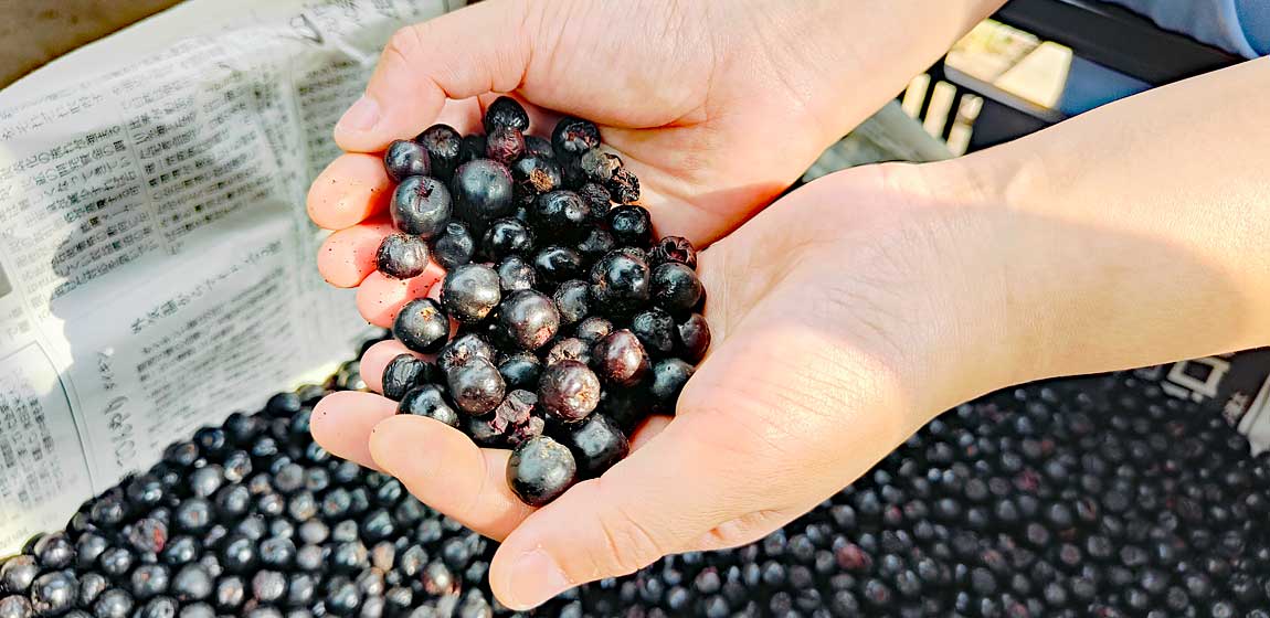 収穫した実は一粒ずつ丁寧に選別。見た目はブルーベリーに似ていますが、生のままでは渋みが強いのが特徴です。そのため冷凍と解凍を繰り返すことで細胞を壊し、食べやすくしています。