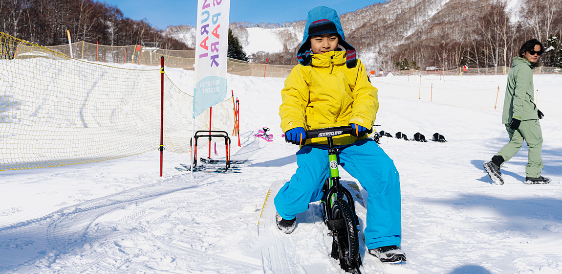 ストライダーは雪の上でも走れるのをご存じですか?タイヤにソリ型アタッチメントを装着しているので、いつもの感覚で自由に雪上を走ることができます。スキーやスノーボードにまだ慣れていないお子様も、楽しく“滑る”感覚を体験できるのが魅力です。パークに入場すると一目散に向かうお子様が多い、フラットエリアの人気No.1アイテムです。