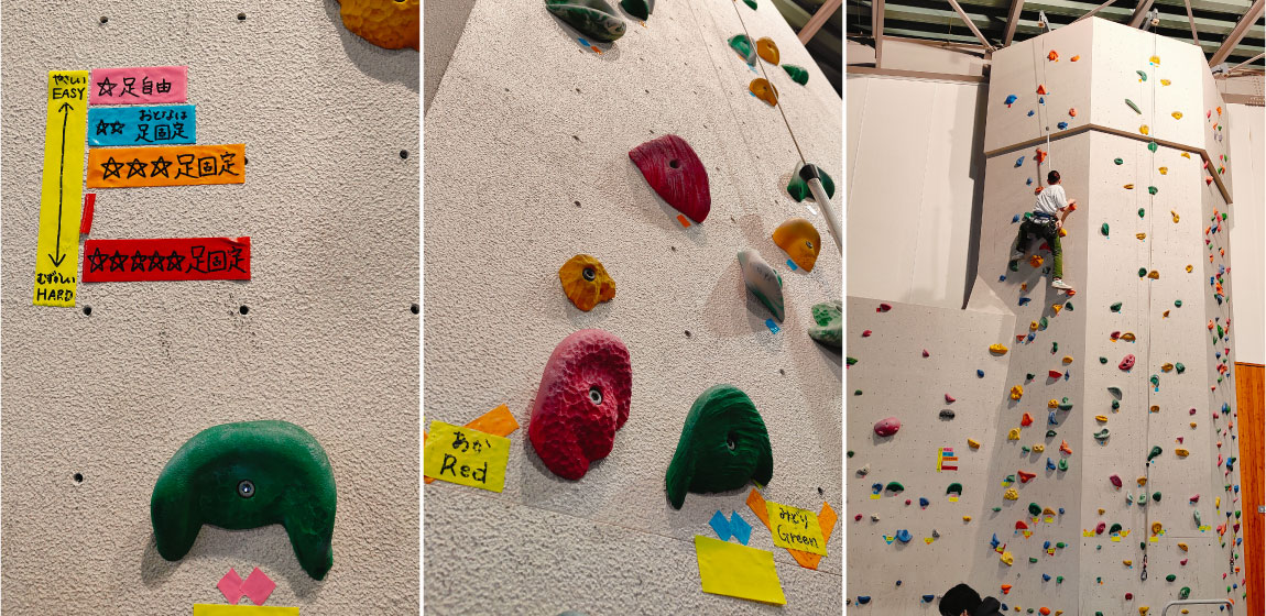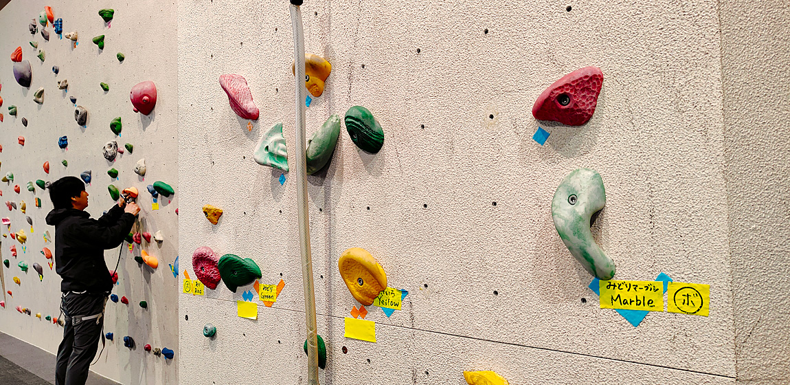 ホールド (突起物) の近くにはテープが貼られており、難易度ごとに指定された色のホールドを使ってゴールを目指します。テープの剥がれやホールドの緩みがないかを一つひとつ丁寧にチェックし、安全に楽しめる状態を保っています。