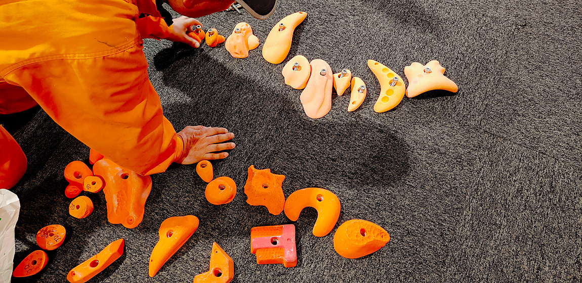 ゴール付近の動きに変化を持たせるため、新しいホールドを追加。どのようなルートで登るかをイメージしながら配置を決めていきます。ホールドにはさまざまな形があり、手のひらでしっかり掴むものや、指を引っかけて使うものなど持ち方も多彩。バランスや動きの面白さを考えながら設計しています。