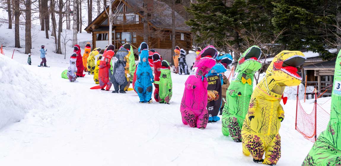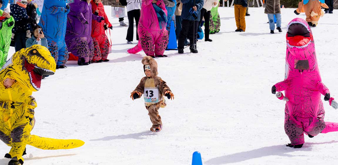 ティラノサウルススーツに身を包んだ挑戦者たちが、雪上を駆け抜けます。ゴールを目指して駆け抜ける“恐竜たち”の姿に、スキーヤー・スノーボーダーも思わず足を止めて応援したくなること間違いなし!走りに自信がある方はもちろん、仮装パフォーマンスで会場を盛り上げる参加者も大歓迎です。入賞ティラノには豪華賞品もご用意しています。滑走ではなく疾走で残り少ないゲレンデで熱いバトルを繰り広げよう。