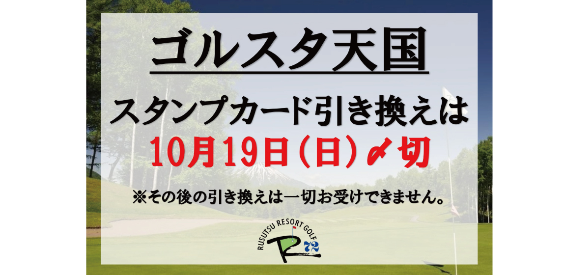 加森観光グループ 道内ゴルフ場共通規格「ゴルスタ天国2025」におけるスタンプカードのポイント利用券への引き換えにつきまして、ルスツリゾートゴルフ72では、2025/10/19(日)を〆切日とさせていただきます。この期日以降の交換につきましては、郵送等においても承ることができませんのでご了承ください。
