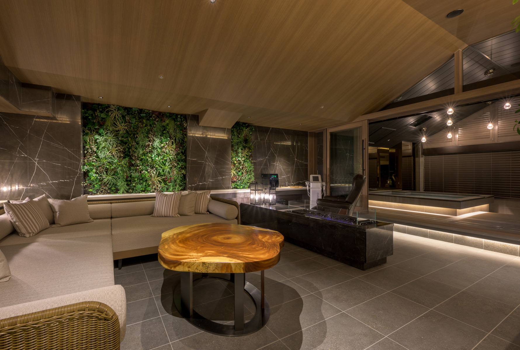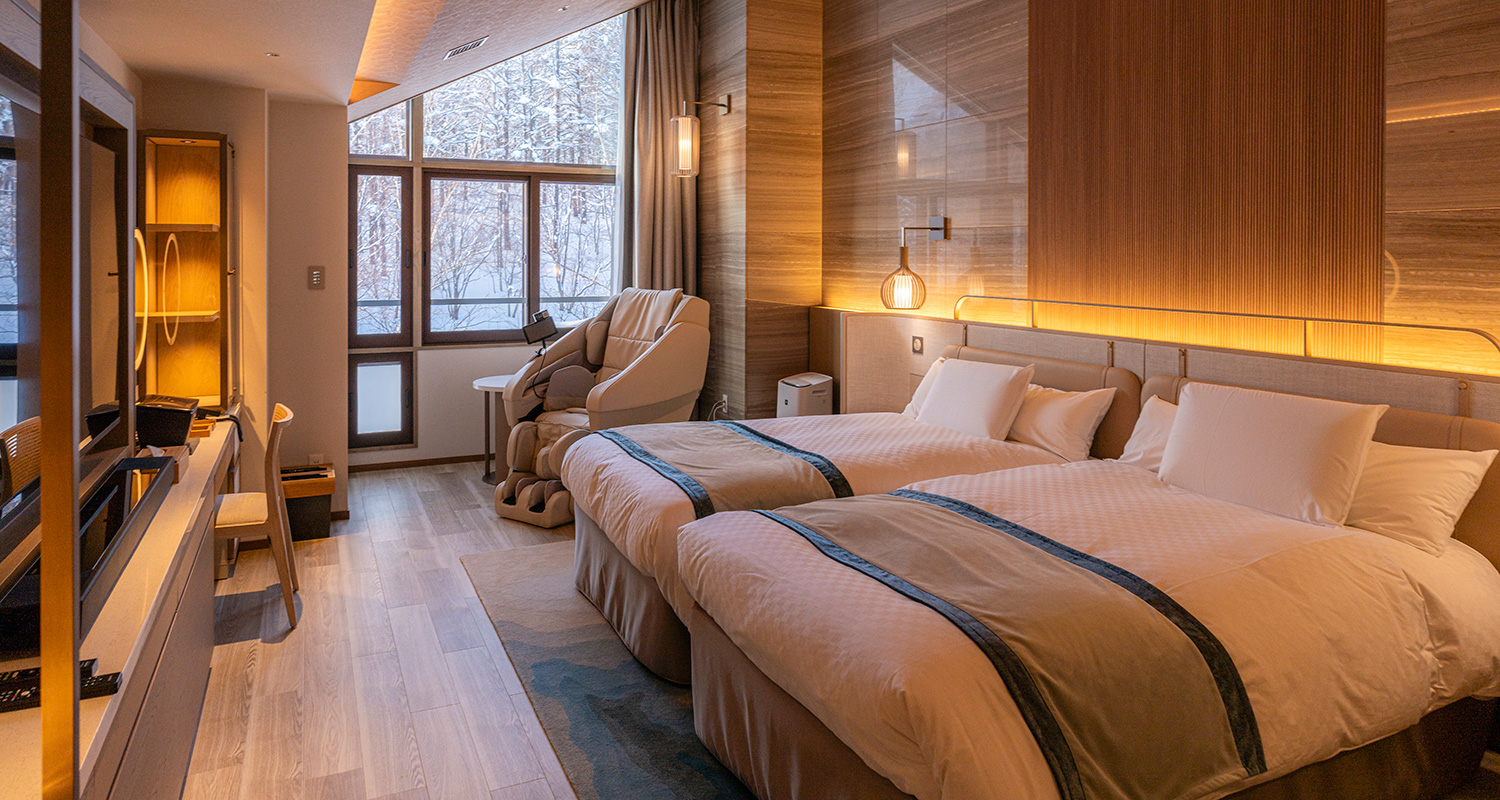 ウェルネスをこだわり尽くした最上級の健やかさと美しさと安らぎを。全2室のみご用意した、ハイグレードなスイートルームです。プライベートのドライサウナや酸素カプセル、エステマシンなど、心と身体を潤すウェルネスなしつらえの数々が備わる、落ち着いた大人のためにご用意した居城。バスタイムを華やぐプロジェクションマッピングをはじめ、光や音、香り、暖炉の温もりなど、五感を研ぎ澄ます演出もお好みのシーンで奏でられます。