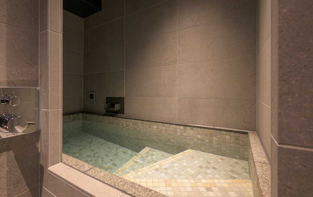 洞窟を思わせる石造りの水風呂で、火照った身体を素早くクールダウン。ザブンと浸かれるのはもちろん、打たせ湯のごとく流れ落ちる水を頭から浴びることも。お部屋の製氷機の氷を入れ、極冷の水風呂にするのもおすすめです。