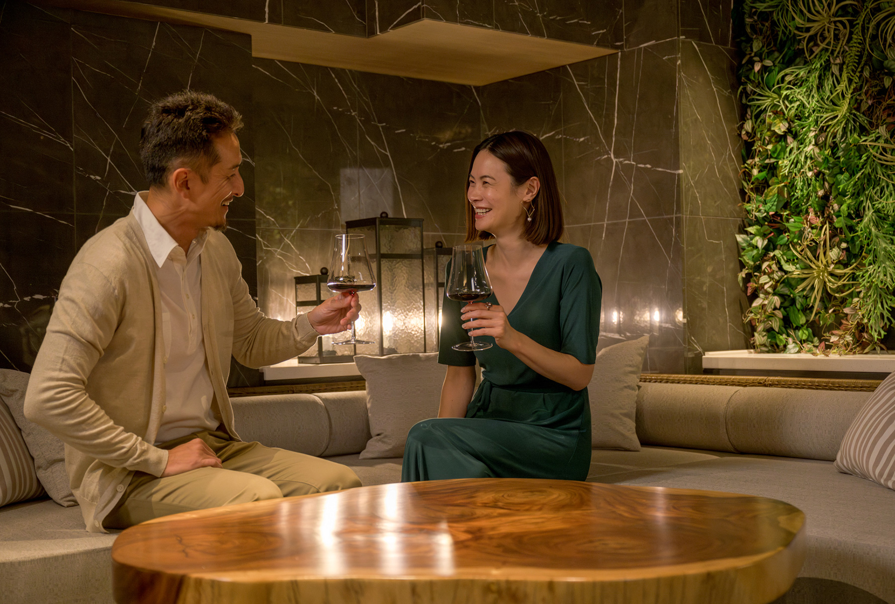 ゆとりのある間取りをお2人だけで。広々としたリビングルームが印象的な客室。1室あたり99㎡で2名定員のお部屋。木目が映える大きなテーブルや緑を施した壁面が印象的なリビングルームと、ナチュラルモダンのベッドルームを配します。リビング奥のサウナやホットバスはこの部屋だけの特権です。