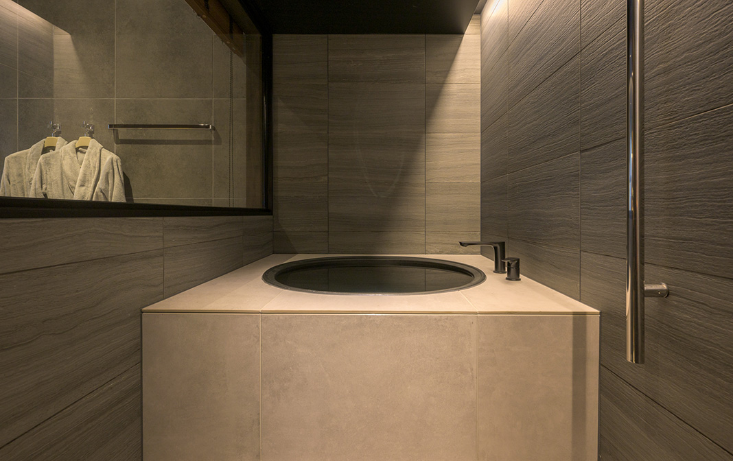 五右衛門風呂のごとく黒い丸型のバスタブが印象的な水風呂。深さがあり頭まで浸かることもでき、バレルサウナとともにアウトドア気分でサウナライフを楽しめます。湯を張って五右衛門風呂気分での湯あみもおすすめです。