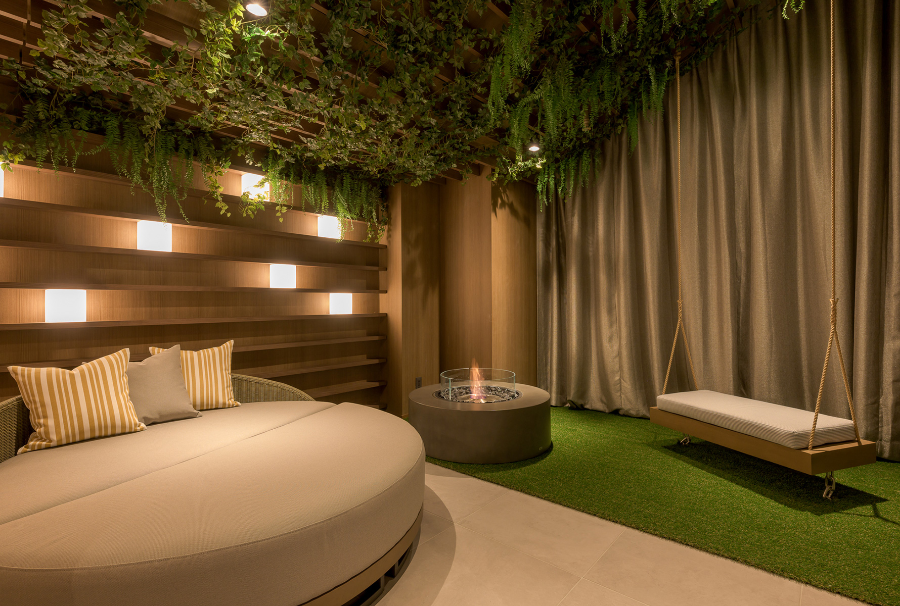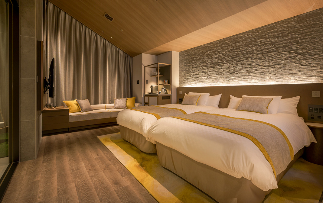 アウトドアでのウェルネスな過ごし方をインスパイア。全12室ご用意した、遊び心とゆとりを感じられるハイエンドなスイートルームです。ロウリュもできるバレルサウナや五右衛門風呂風の水風呂、アウトドアソファやブランコベンチなどが備わり、お部屋の中にいながらにして緑の木々に囲まれた屋外を思わせる佇まい。室内グランピングをしているような、大人のための新しい隠れ家です。お好みの音楽やアロマに包まれてお過ごしください。