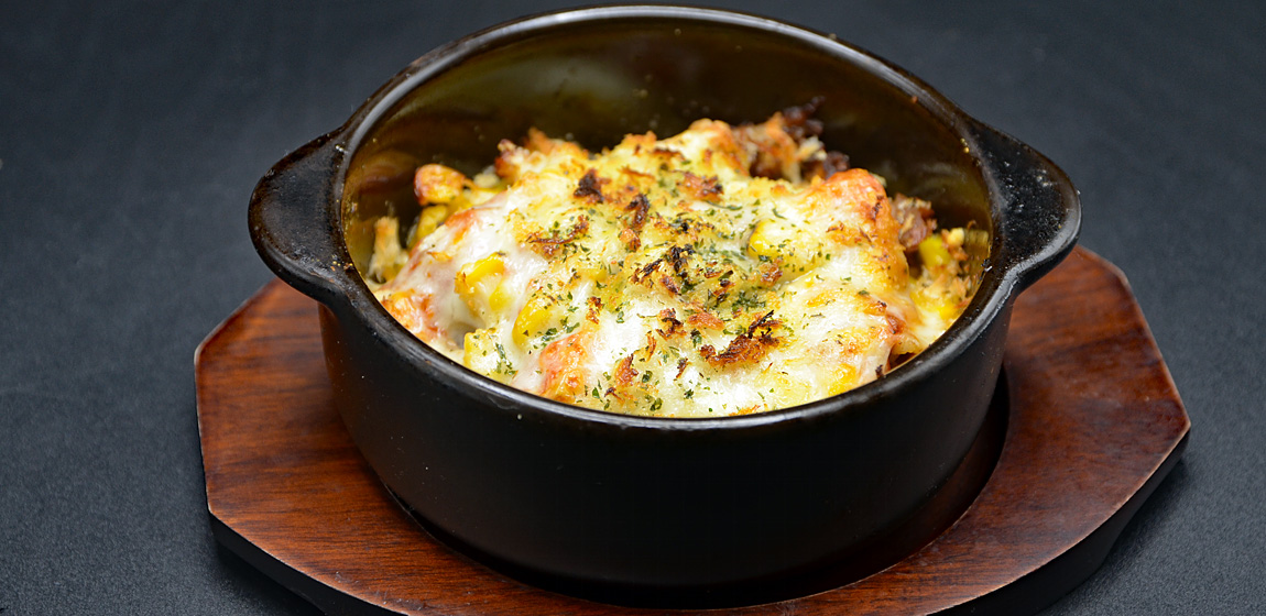 コーンをたっぷり盛り、トマトソースとホワイトソースのWソースにたっぷりとチーズをのせて焼き上げました。コーンの甘みとプチプチ食感に、チーズの塩気とコクが加わるやみつきの一品。白ワインやビールはもちろん、フルーティーな日本酒とも好相性です。