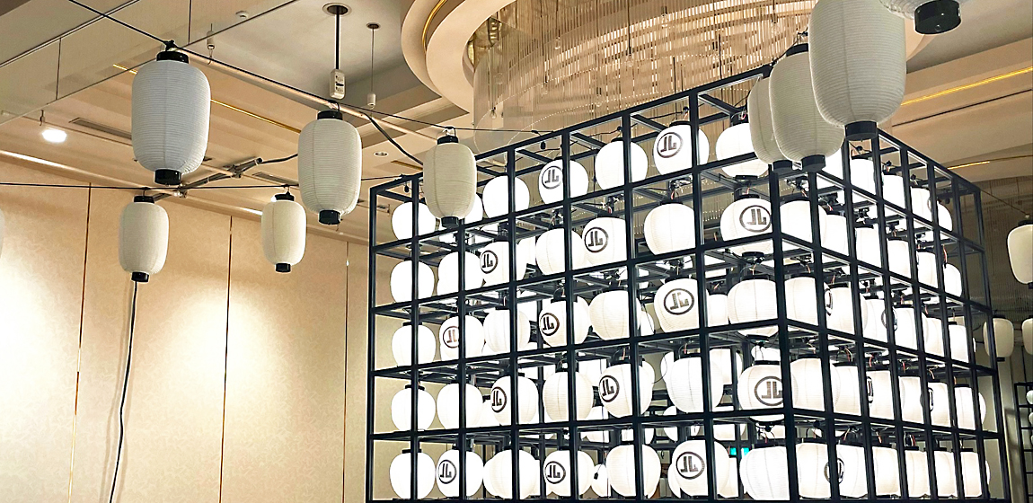 会場には提灯が飾られ、縁日ムード満点。焼き鳥や唐揚げ、わたあめなど、屋台気分を味わえるメニューをご用意しています。