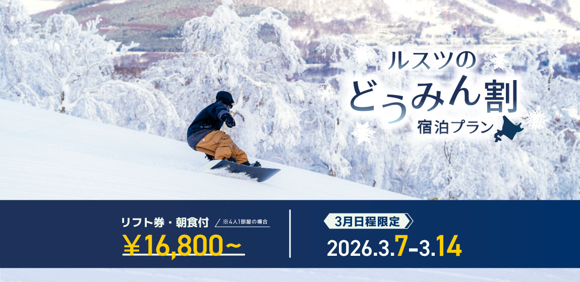 ルスツリゾートは、3月になっても豊富で良質な雪が楽しめます!2026/3/7 ~ 14の日程限定で、リフト券が付いた北海道民限定宿泊プラン「どうみん割」が登場!さらに学生にはお得な学割プランもございます。