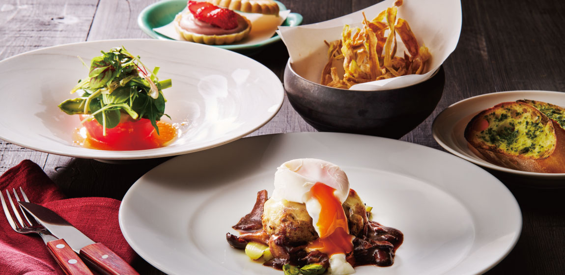 ナイフを入れると溢れ出す旨みが濃縮された肉汁に、とろりと半熟のポーチドエッグが絡み、たっぷりのチーズとソースの香ばしい香りが食欲をかき立てます。五感で味わう鉄板焼きならではのコースにはワンドリンクと温泉入浴が付いて、ちょっと贅沢なご褒美ランチをお楽しみいただけます。