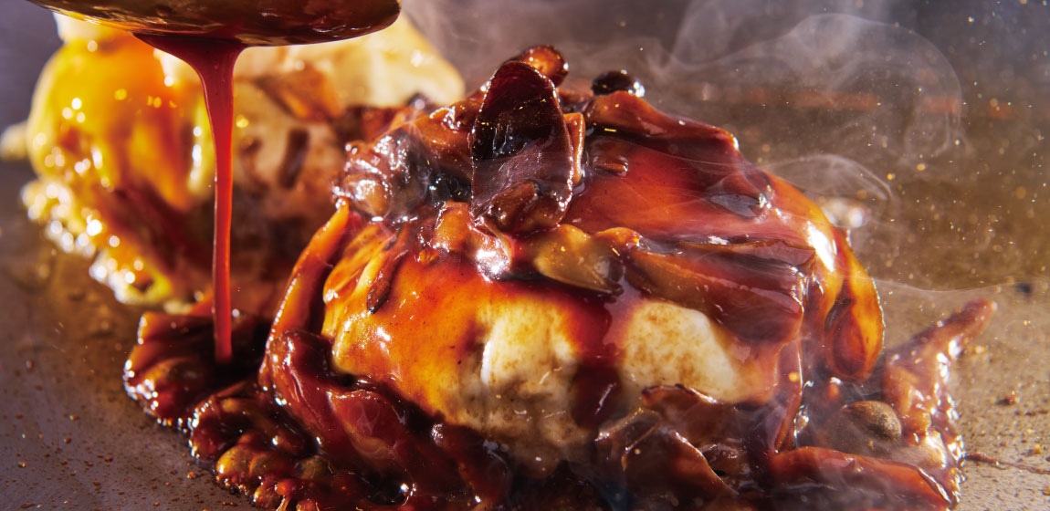 鉄板焼きカウンターでは、シェフが目の前で北海道産白老牛とルスツ高原豚を使ったハンバーグを、高温の鉄板でジューシーに焼き上げます。