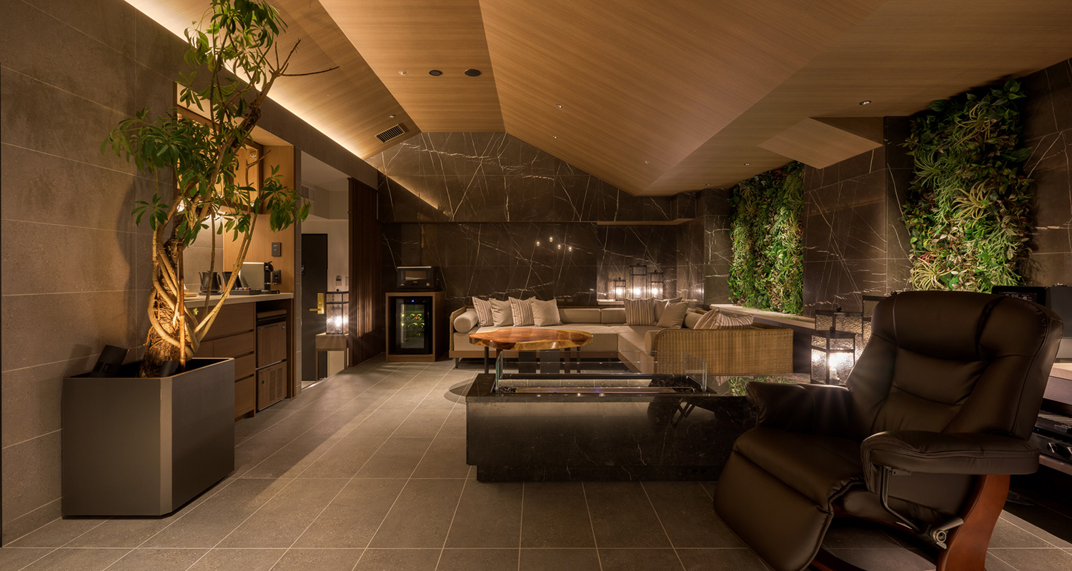 ゆとりのある間取りをお2人だけで。広々としたリビングルームが印象的な客室。1室あたり99㎡で2名定員のお部屋。木目が映える大きなテーブルや緑を施した壁面が印象的なリビングルームと、ナチュラルモダンのベッドルームを配します。リビング奥のサウナやホットバスはこの部屋だけの特権です。