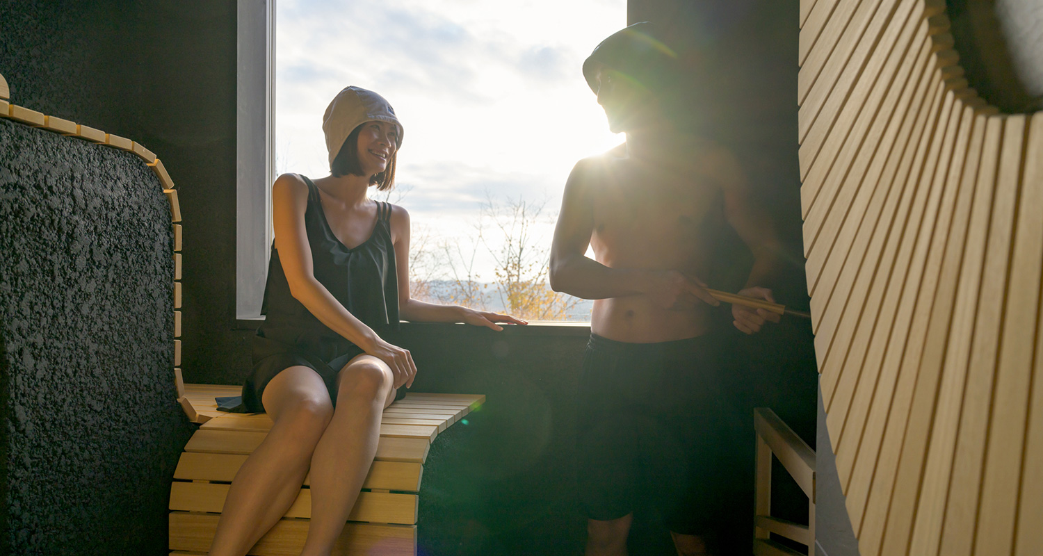窓越しに四季を眺められるドライサウナ。木目の座面は上・中・下の3ステップあり、視点を変えて腰を据えられます。壁に北海道上ノ国町産の天然鉱石、遠赤外線ブラックシリカを使用。セルフロウリュも気ままにお楽しみください。