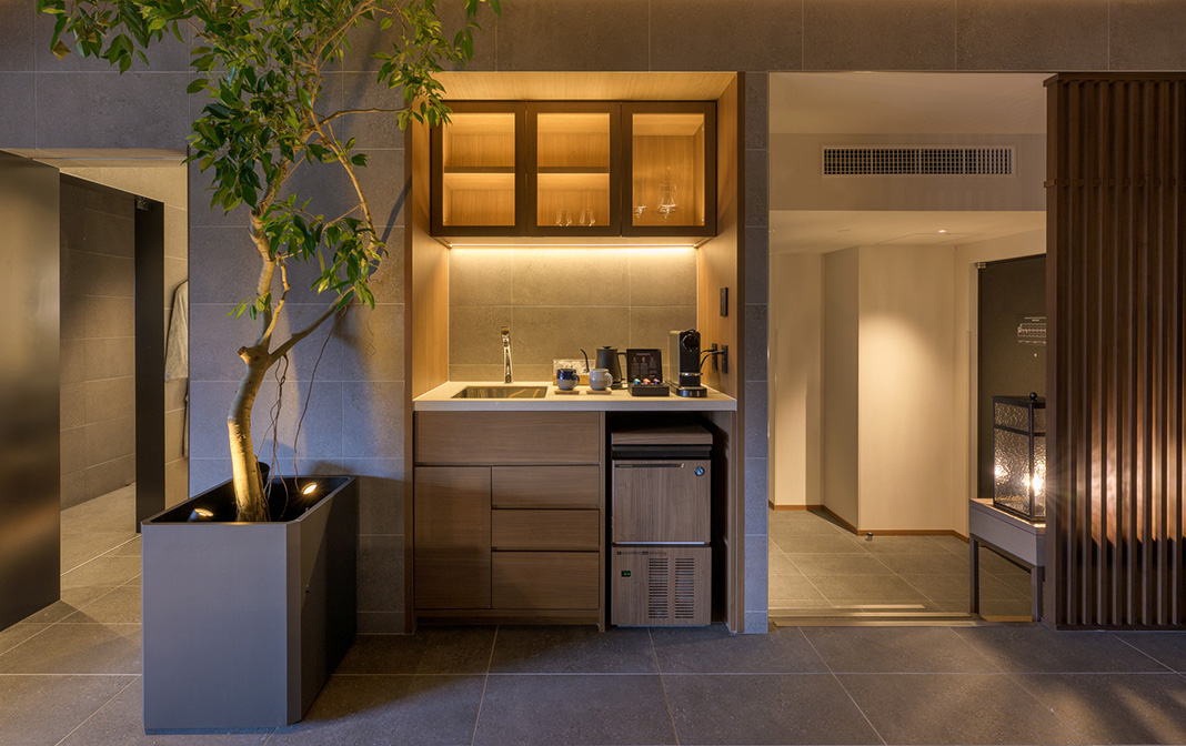 お部屋にポットやレンジのほか、製氷機やワインセラーまであり、快適なカフェタイムやバータイムを過ごせます。備え付けのルスツオリジナルのお茶やネスプレッソなど、お好みでお召し上がりください。