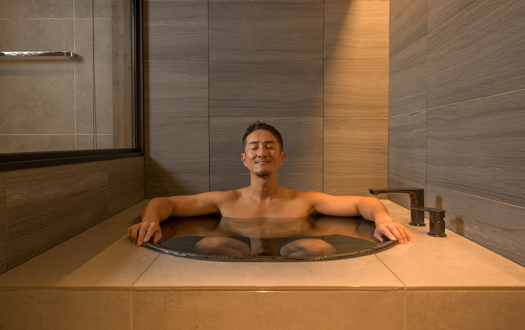 五右衛門風呂のごとく黒い丸型のバスタブが印象的な水風呂。深さがあり頭まで浸かることもでき、バレルサウナとともにアウトドア気分でサウナライフを楽しめます。湯を張って五右衛門風呂気分での湯あみもおすすめです。